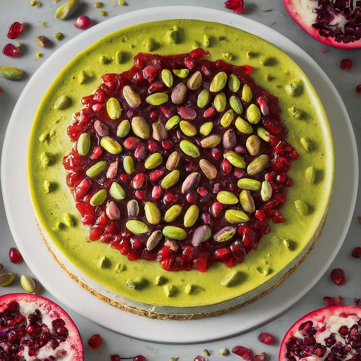 Ein cremiger, veganer Pistazien-Käsekuchen mit erfrischender Granatapfelsauce. Ein unwiderstehliches Dessert für Pistazien-Liebhaber!