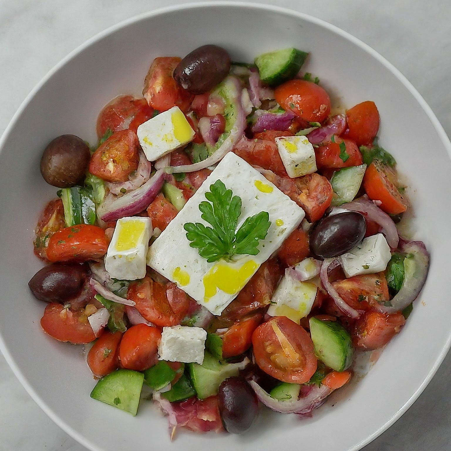 | 2. | Gurke, Tomaten, rote Zwiebel, Feta und Oliven in einer Schüssel vermengen. |