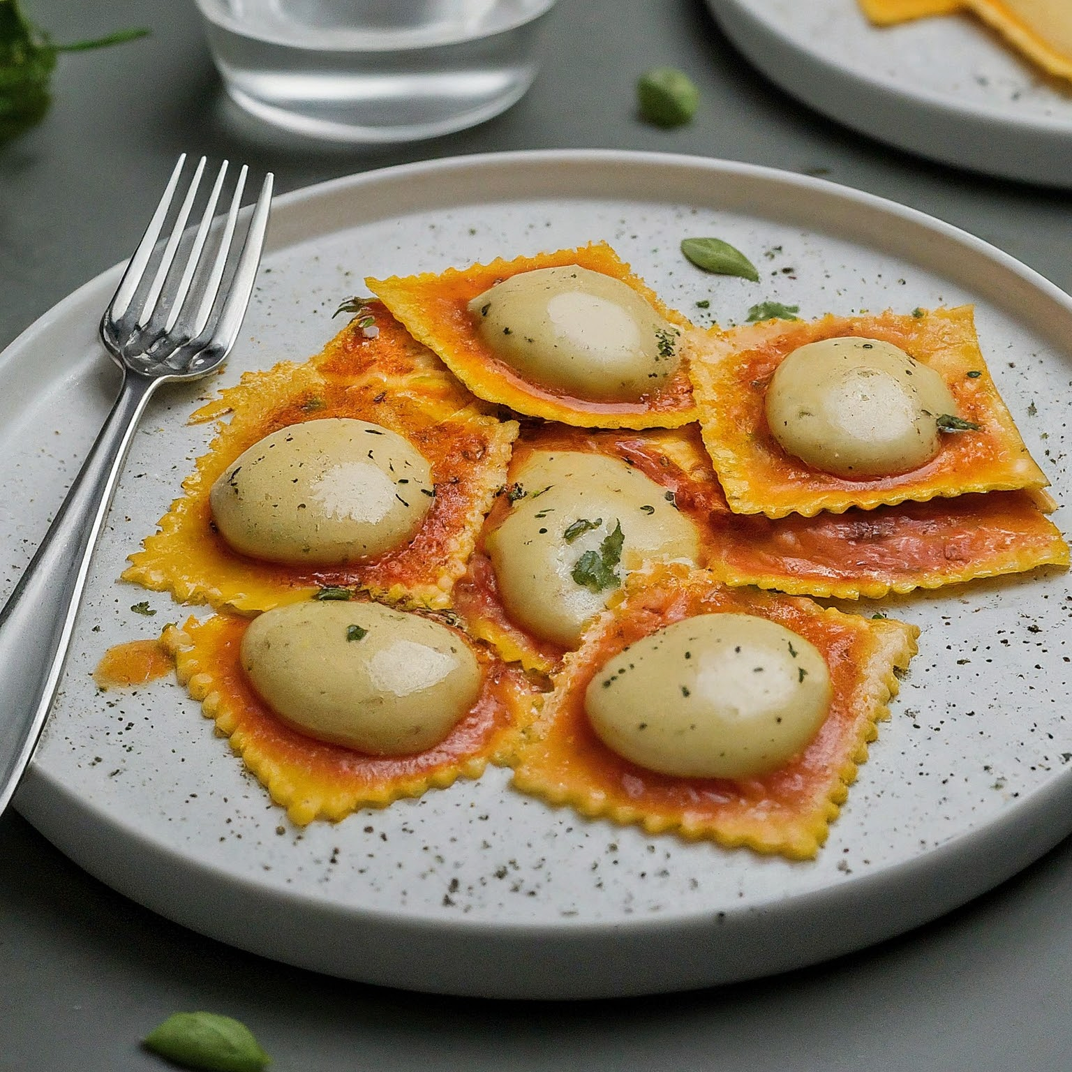 | 5. | Ravioli darauf verteilen und mit der restlichen Soße bedecken. |