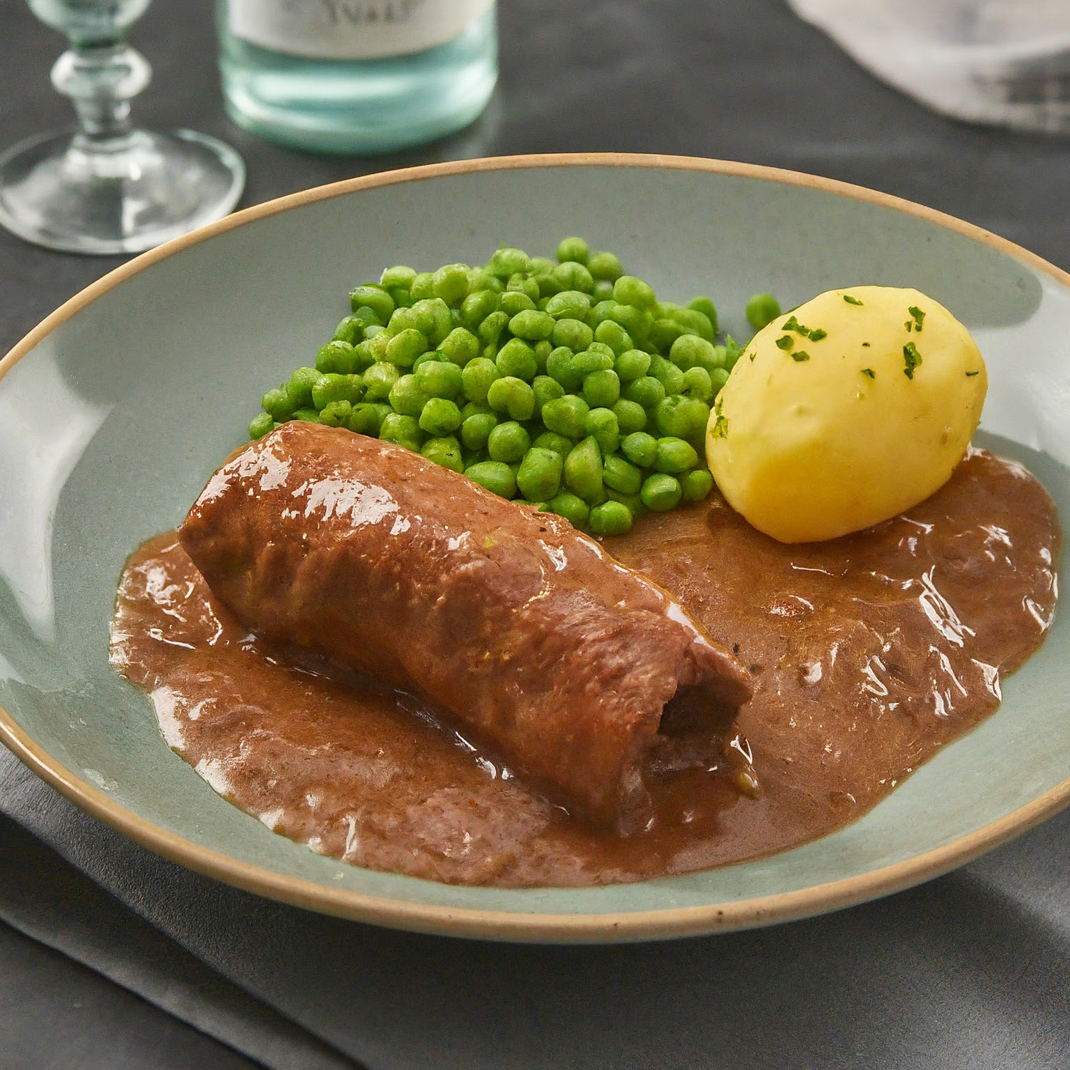 Klassische Rinderrouladen mit Speck, Zwiebeln und Gewürzgurken gefüllt, in Rotwein geschmort – ein deutsches Traditionsgericht.