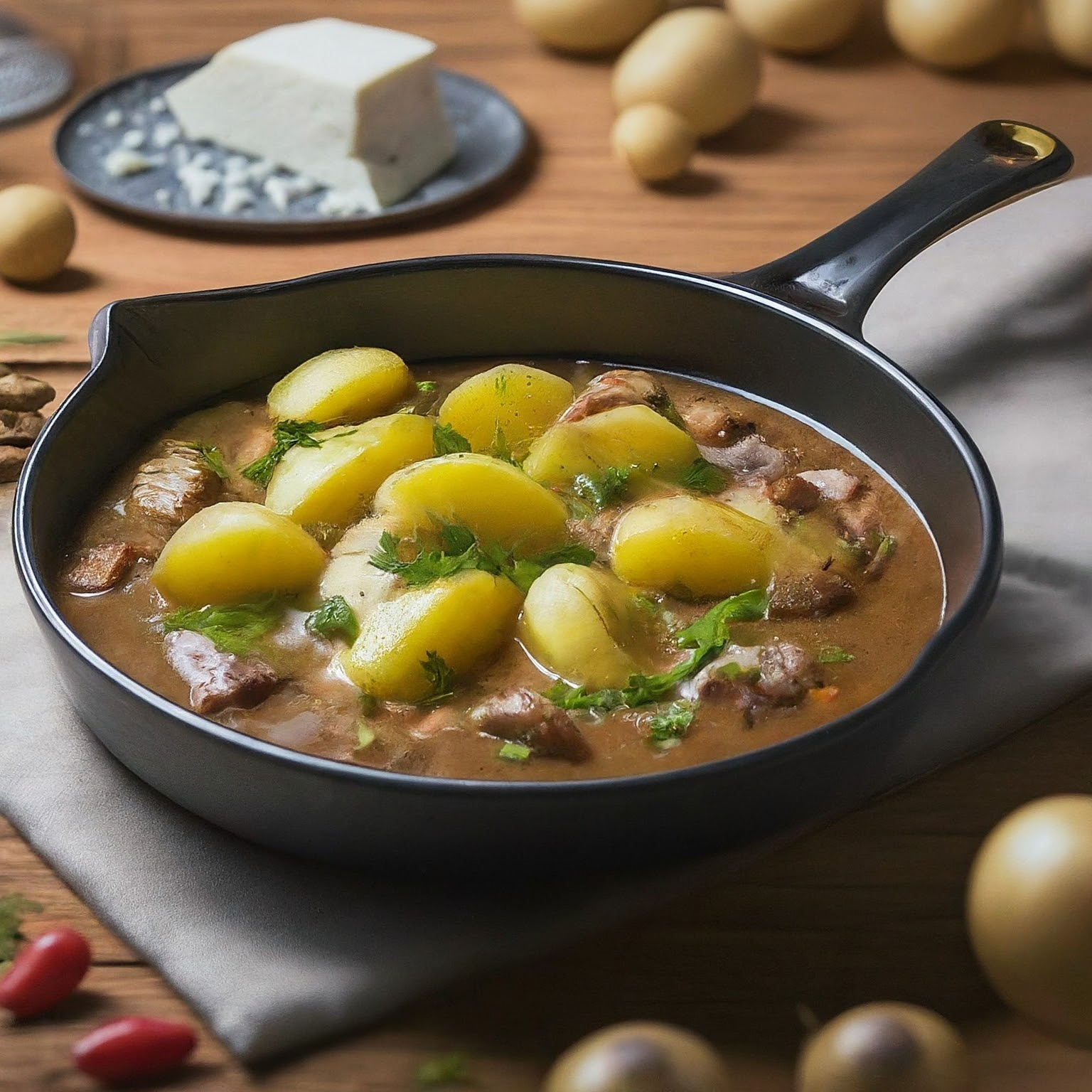 | 4. | Mit Gemüsebrühe ablöschen, salzen, pfeffern und zugedeckt ca. 15-20 Minuten köcheln lassen, bis die Kartoffeln gar sind. |