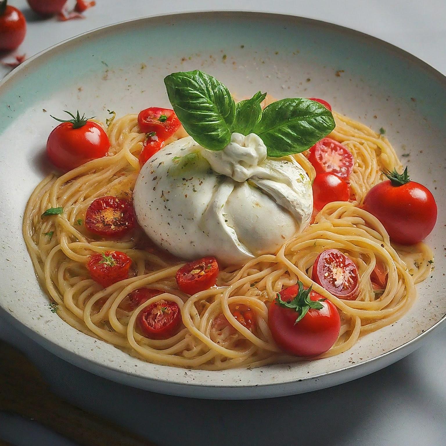 Cremig-zarte Burrata trifft auf sonnengereifte Tomaten und al dente gekochte Spaghetti – ein schnelles und einfaches Rezept für den perfekten italienischen Genuss. Dieses Gericht ist ideal für warme Sommerabende und begeistert mit seiner frischen und aromatischen Kombination.