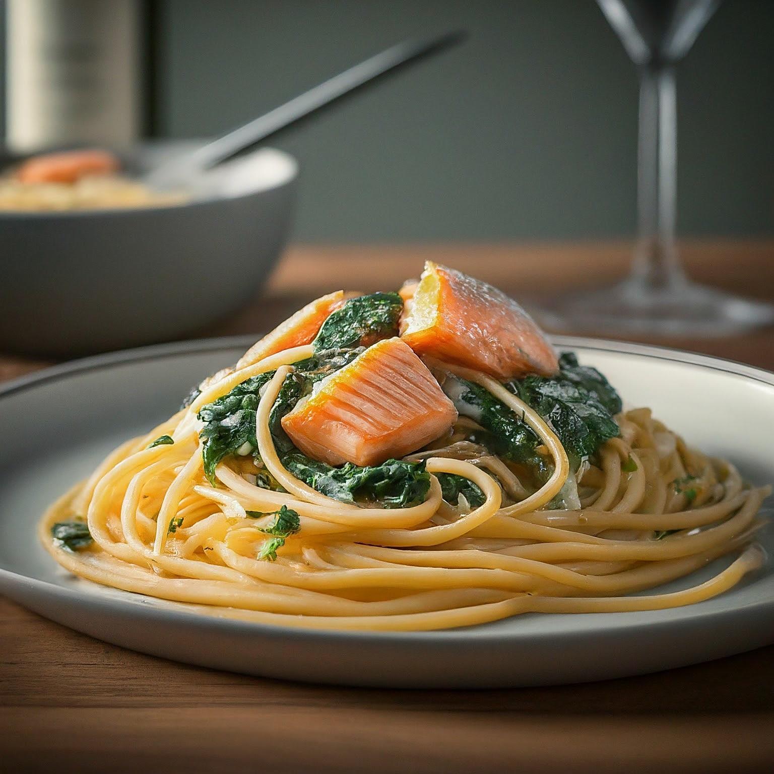 | 5. | Spaghetti, Spinat und Lachs (in mundgerechte Stücke geschnitten) in die Soße geben und gut vermengen. |