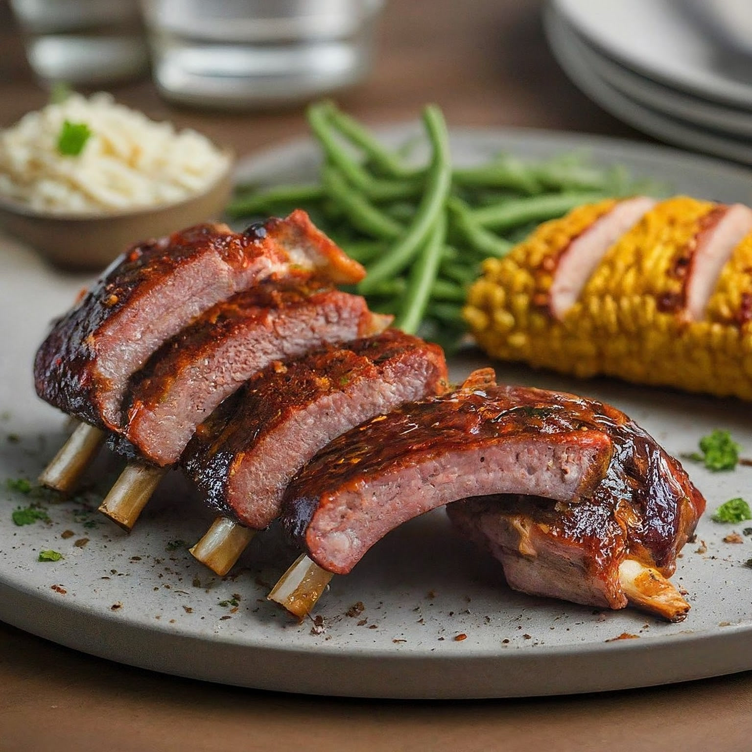 | 4. | Die Folie entfernen und die Ribs weitere 30 Minuten grillen oder backen, bis sie knusprig und karamellisiert sind. Dabei gelegentlich mit BBQ-Sauce bestreichen (optional). |