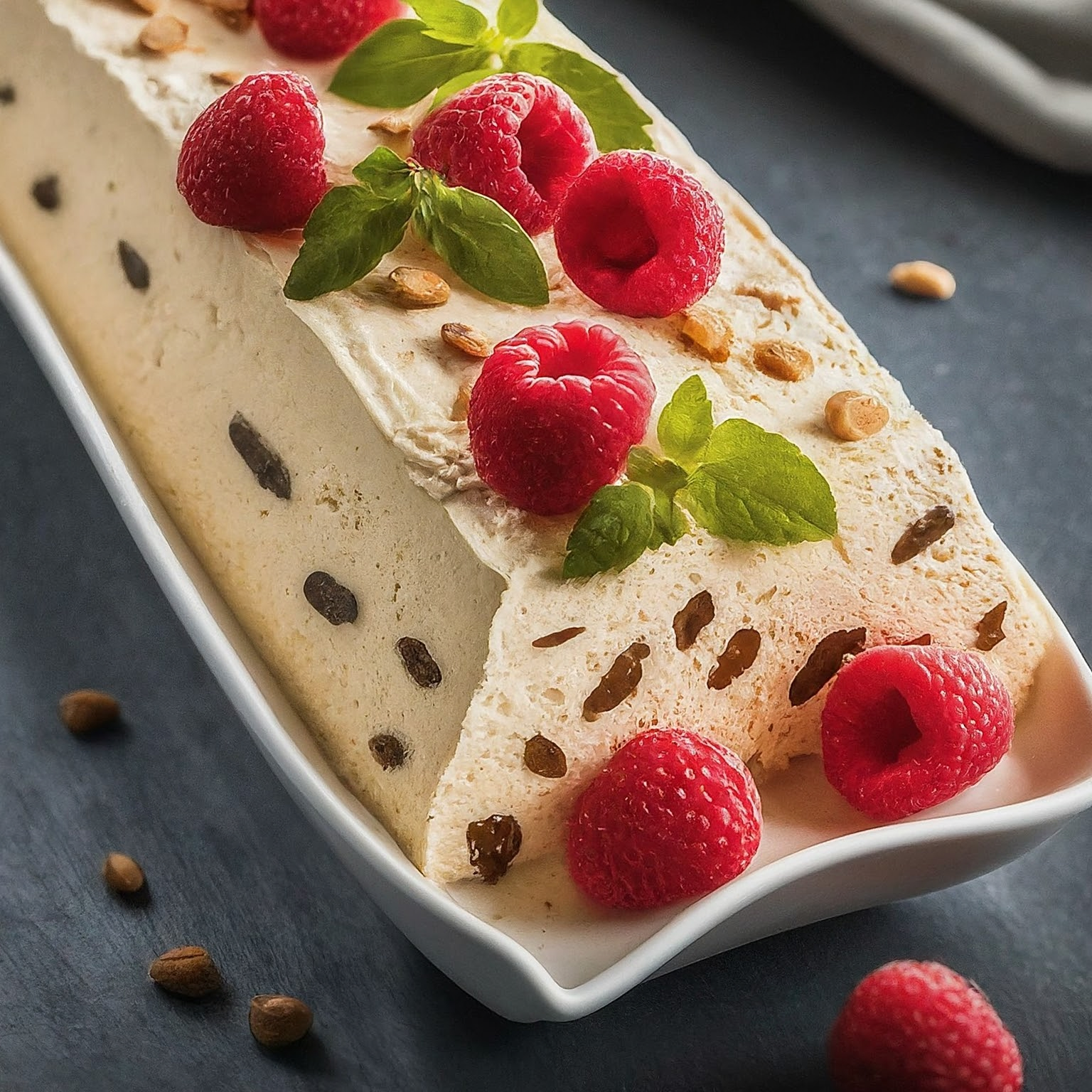 Ein erfrischendes und cremiges Semifreddo mit dem knusprigen Biss von Torrone. Ein perfektes Dessert für den Sommer!