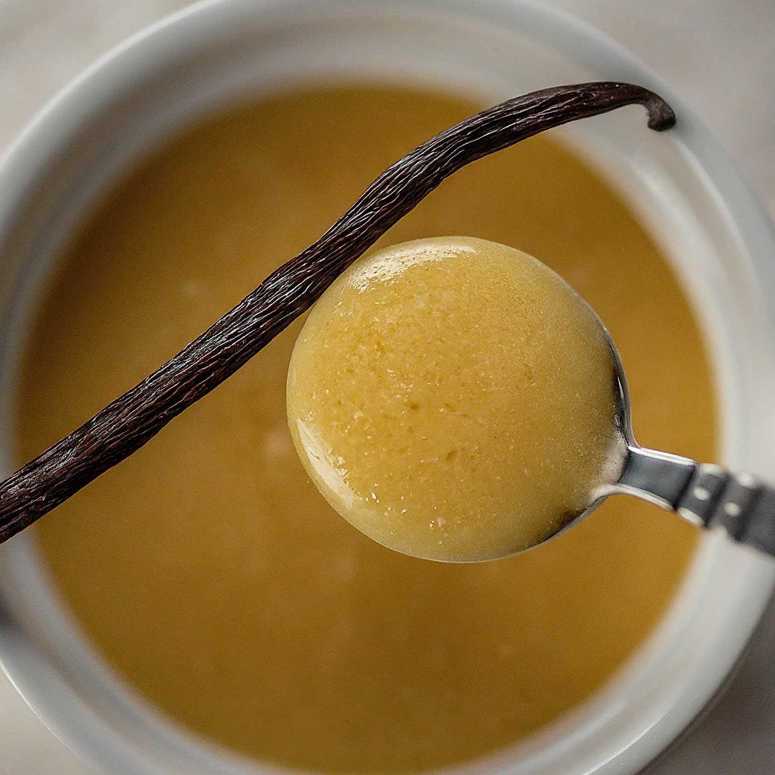 | 3. | Die ausgekratzte Vanilleschote ebenfalls in das Glas legen. |