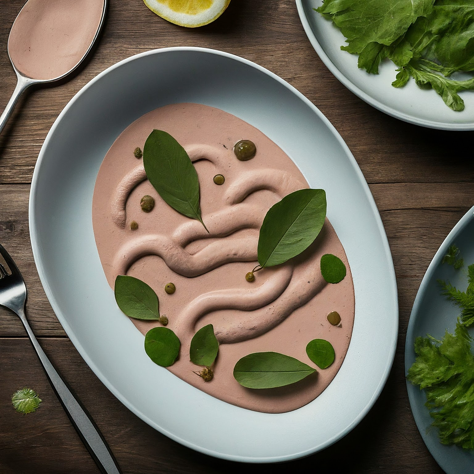 5.Kalbfleischscheiben auf einem Teller anrichten und mit der Thunfischsauce übergießen.
