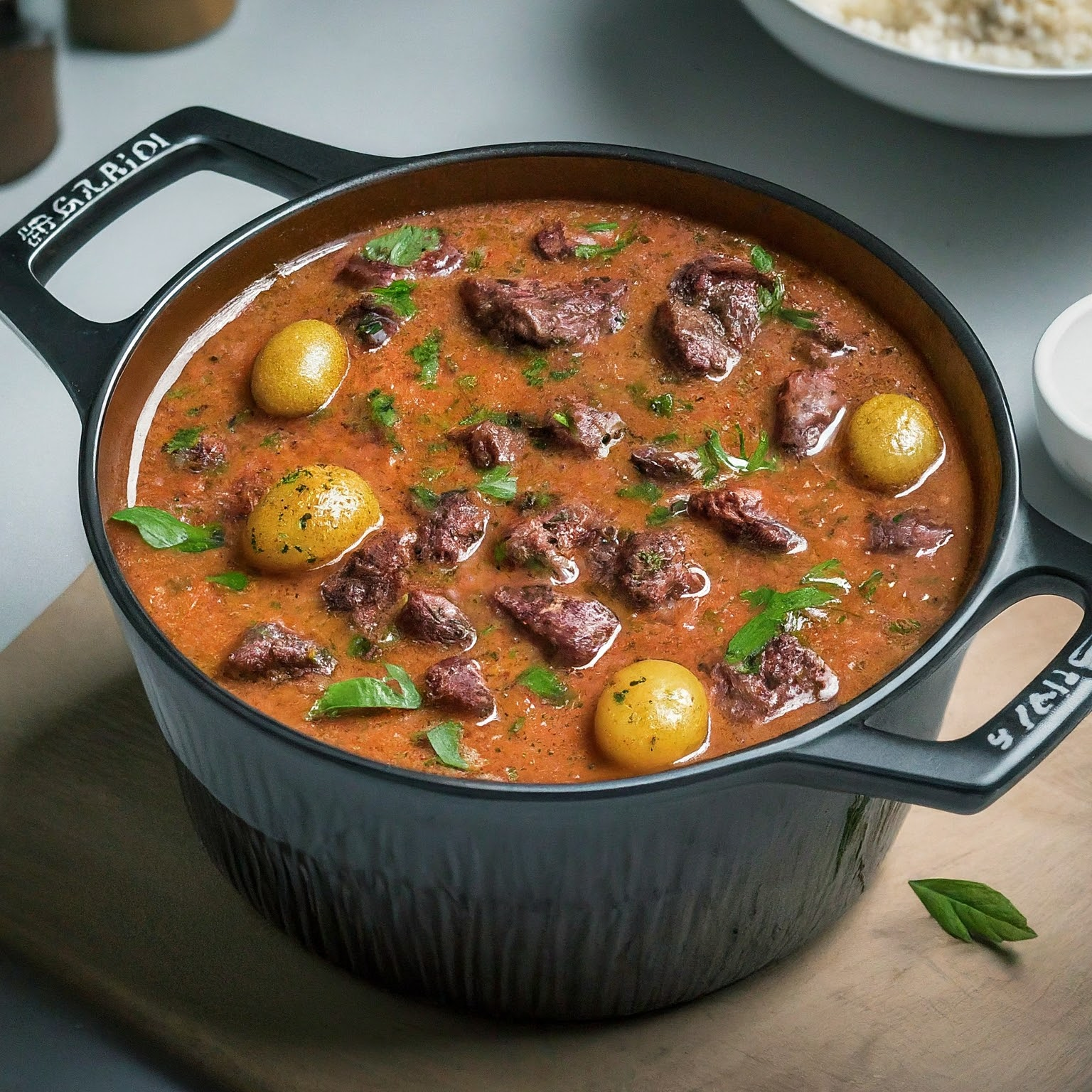 | 8. | Alles zum Kochen bringen, dann die Hitze reduzieren und zugedeckt ca. 2 Stunden schmoren lassen, bis das Fleisch zart ist. |