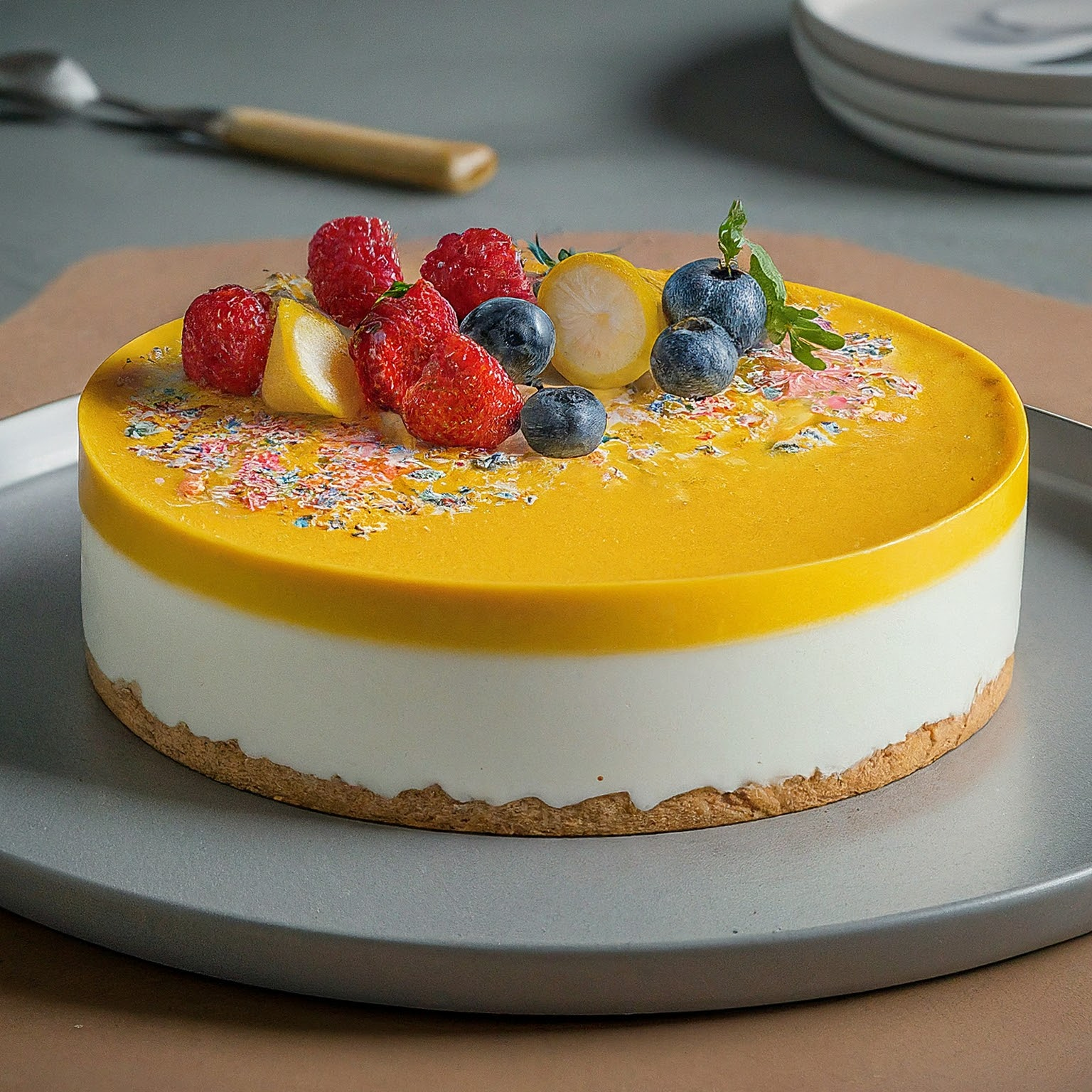 3. | Torte: Den abgekühlten Boden einmal durchschneiden. Die untere Hälfte mit der Hälfte der Creme bestreichen. Den zweiten Boden auflegen und mit der restlichen Creme bestreichen. Mit gehackten Yogurette-Riegeln und Erdbeeren dekorieren. Für mindestens 2 Stunden kalt stellen. |