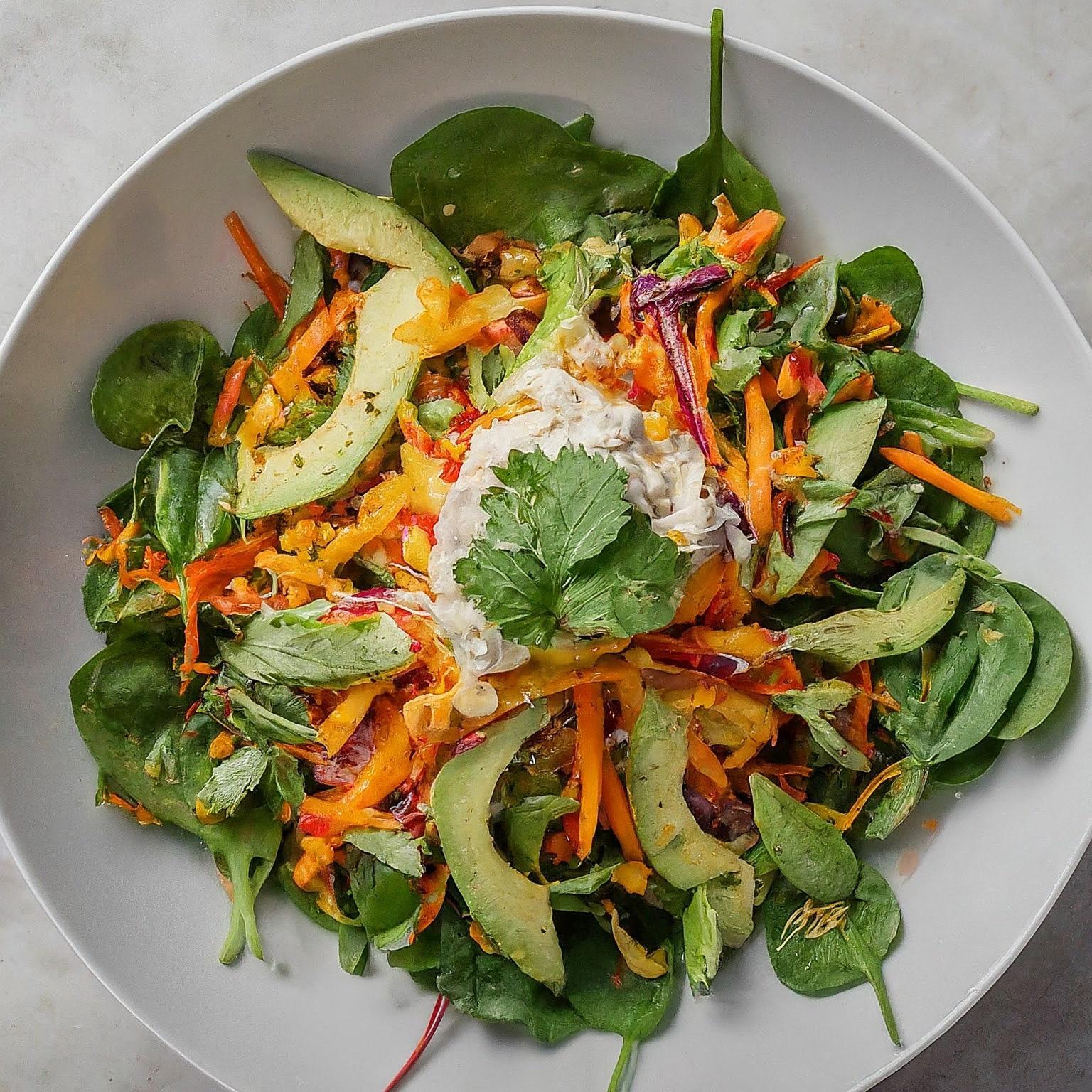 3.Das Dressing über den Salat geben und gut vermengen.