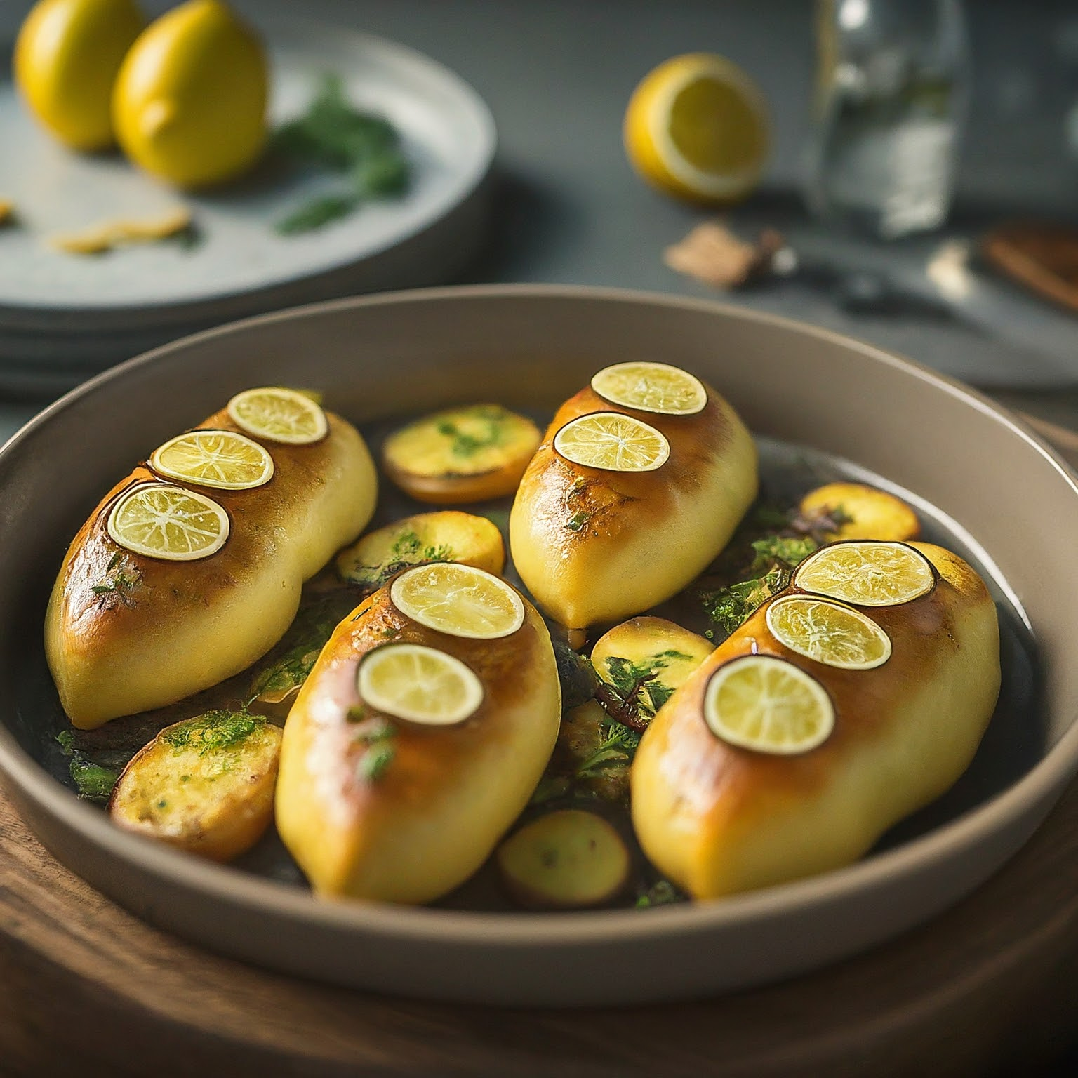 | 4. | Kartoffeln auf einem Backblech verteilen. Hähnchenschenkel darauflegen und mit Zitronenscheiben belegen. |